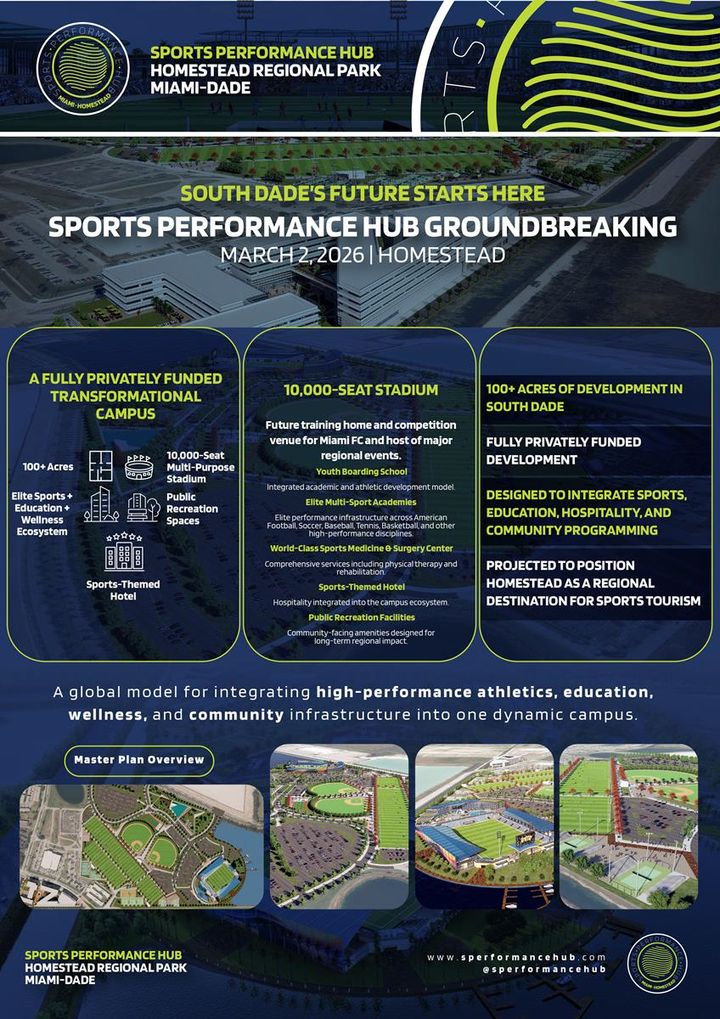 HOMESTEAD, Fla., March 02, 2026 (GLOBE NEWSWIRE) -- The Sports Performance Hub (SPH) has officially begun construction on its 92-acre, world-class sports and education campus. This privately funded $280 million project is set to transform South Dade into a global capital for athletic excellence, academic innovation, and community development, all at no cost to taxpayers. The groundbreaking ceremony, held at the former Homestead Sports Complex, gathered local officials, international sports figures, and civic leaders to mark what many consider a generational investment in the region's youth and economic future.