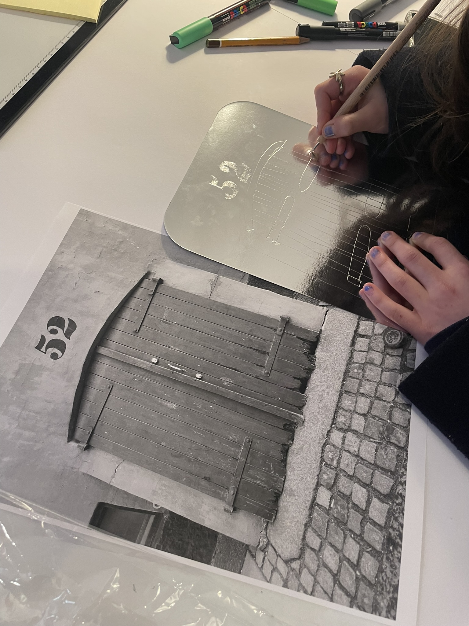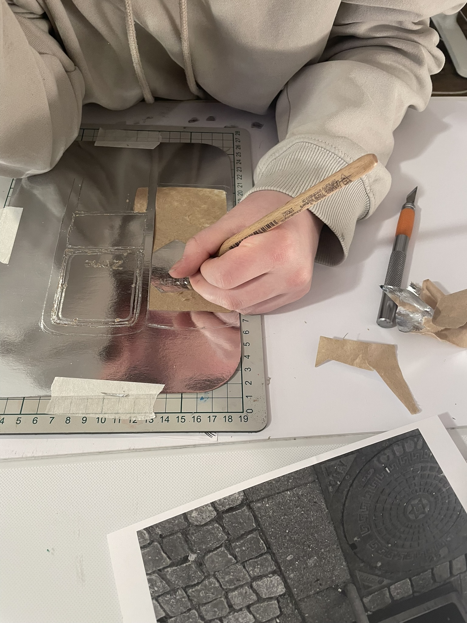 Billedskoleeleverne har i løbet af foråret arbejdet med at undersøge byens teksturer på nært hold. Brosten, murværk, gelændere og andre strukturer er blevet trykt, presset og omsat til personlige værker. Resultatet er en samling små kunstværker, der både afslører det genkendelige og det oversete i Helsingør.