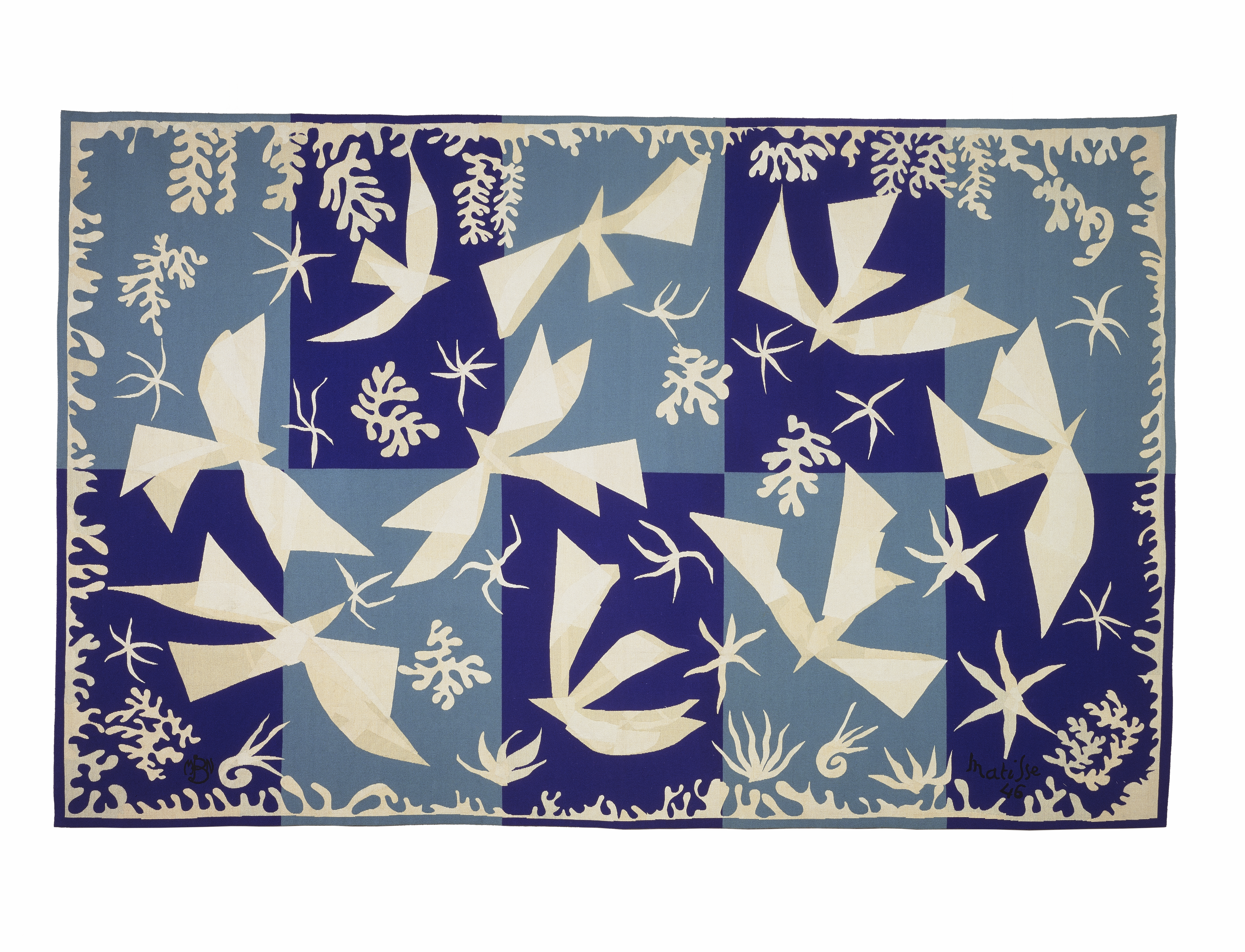 Henri Matisse Polynesien – Himlen, 1950–1951. I udstillingen ses billedvævningen med Matisse’ genkendelige motiv, som mange kender fra plakater, bøger og grafiske tryk. Motivet stammer fra Matisses ikoniske papirklip, der her er omsat til vævning på den franske gobelinfabrik Manufacture des Gobelins. Værket viser, hvordan et ikonisk modernistisk billede kan oversættes fra papir til tekstil. Udlånt af Designmuseum Danmark