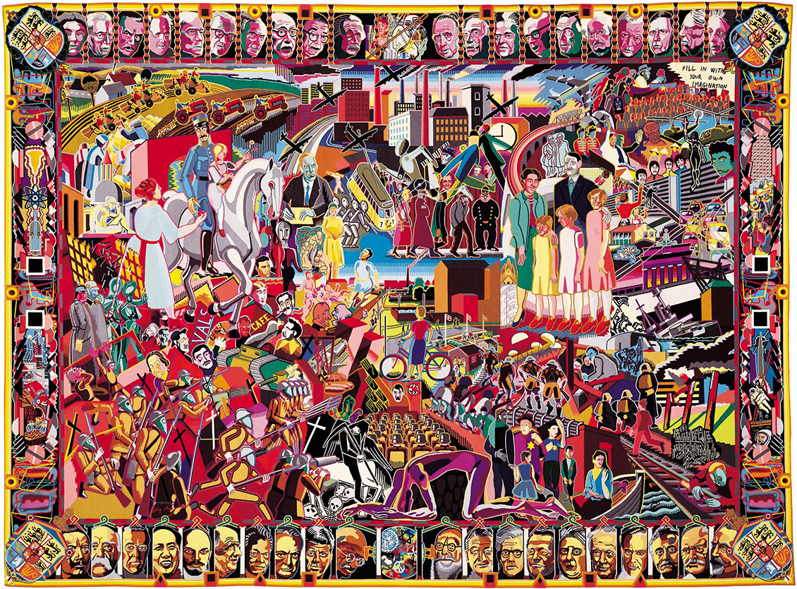 Bjørn Nørgaard Yngre Glyksborgere, 1999. Del af H.M. Dronning Margrethe 2.s gobeliner i Riddersalen på Christiansborg Slot. Gobelinen Yngre Glyksborgere skildrer Danmarks nyere historie gennem et mylder af figurer og begivenheder fra 1900-tallet. Motiver som Genforeningen i 1920, Besættelsen og efterkrigstidens forandringer optræder omgivet af portrætter af tidens markante politiske, kulturelle og intellektuelle skikkelser. Værket er én af i alt 17 gobeliner, der tilsammen fortæller 1000 års danmarkshistorie. Gobelinerne blev skænket til H.M. Dronning Margrethe 2. som gave i anledning af hendes 50-års fødselsdag i 1990 og senere givet som gave til folket. Gobelinerne hænger i dag i Riddersalen på Christiansborg Slot. Udlånt af Statsinventar, Christiansborg Slot, Den Kongelige Samling