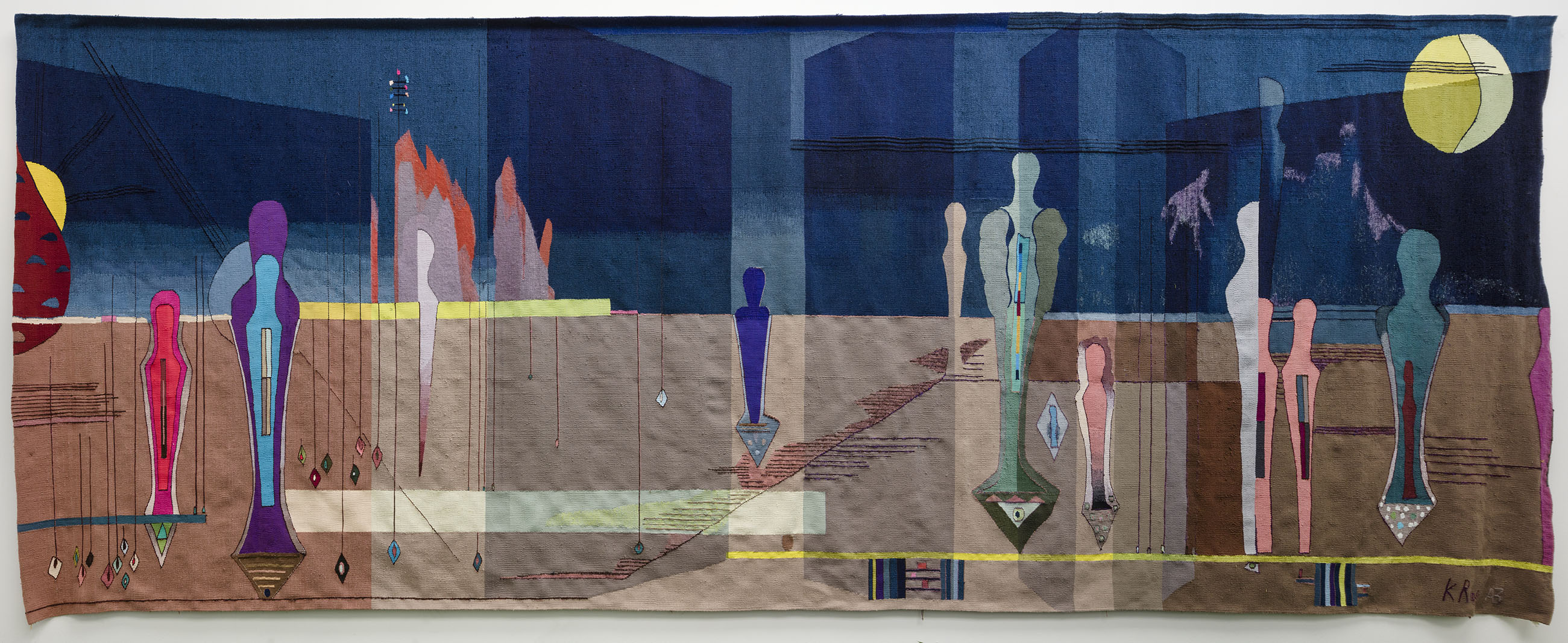 Kirstine Roepstorff Renaissance of the Night, 2017. I Kirstine Roepstorffs billedvævning er mørket og livets bagside centrale temaer. Værket viser, hvordan billedvævningen stadig i dag bruges til at fortælle de store og eksistentielle historier og bærer på den måde kunstformens lange tradition videre. Kirstine Roepstorff er desuden en af kunstnerne bag de kommende Koldinghusgobeliner. Udlånt af Kvadrat A/S
