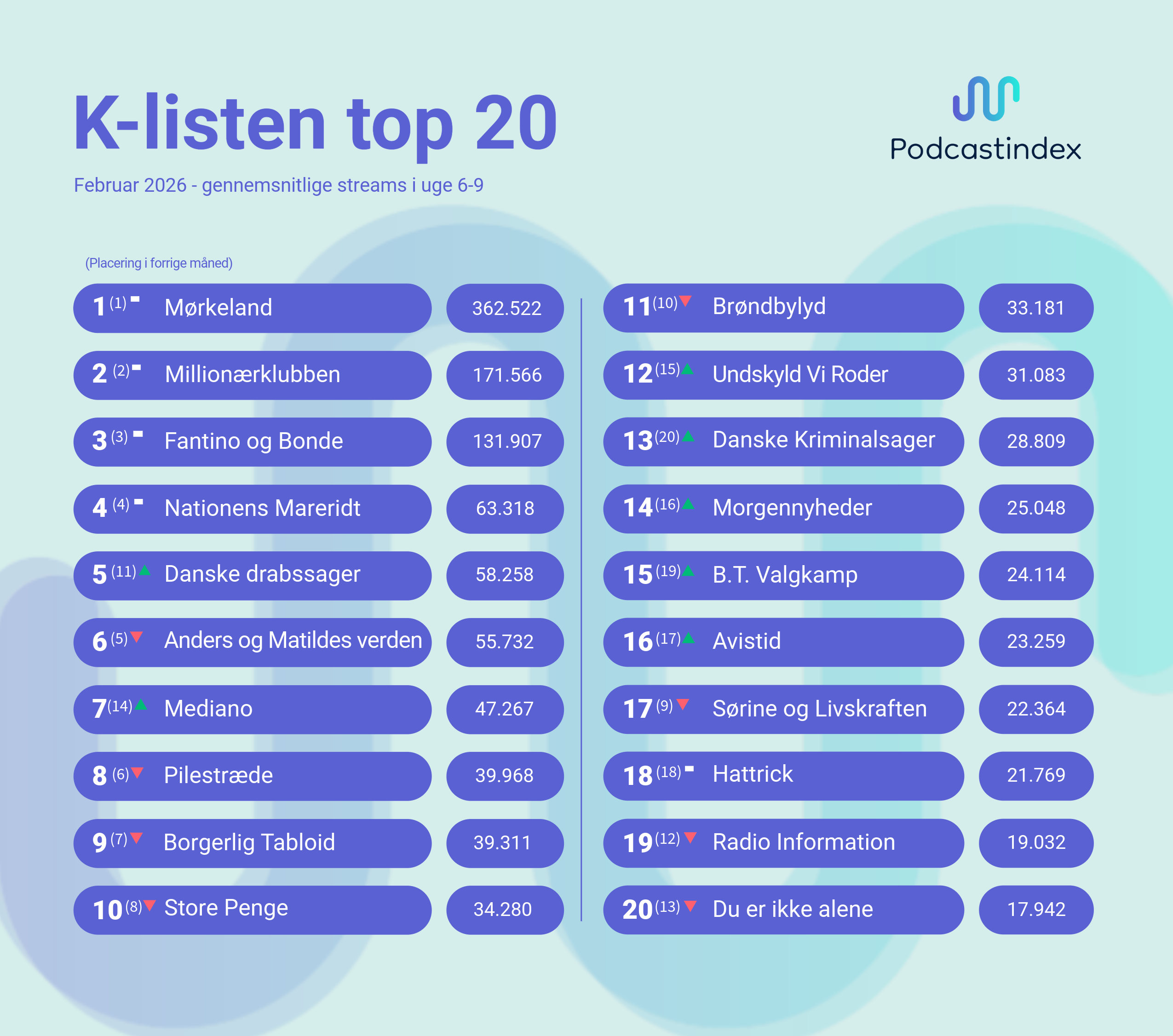 Podcastindex offentliggør den seneste Top 20-liste over de mest lyttede podcasts i Danmark, der udgives på kommercielle vilkår.