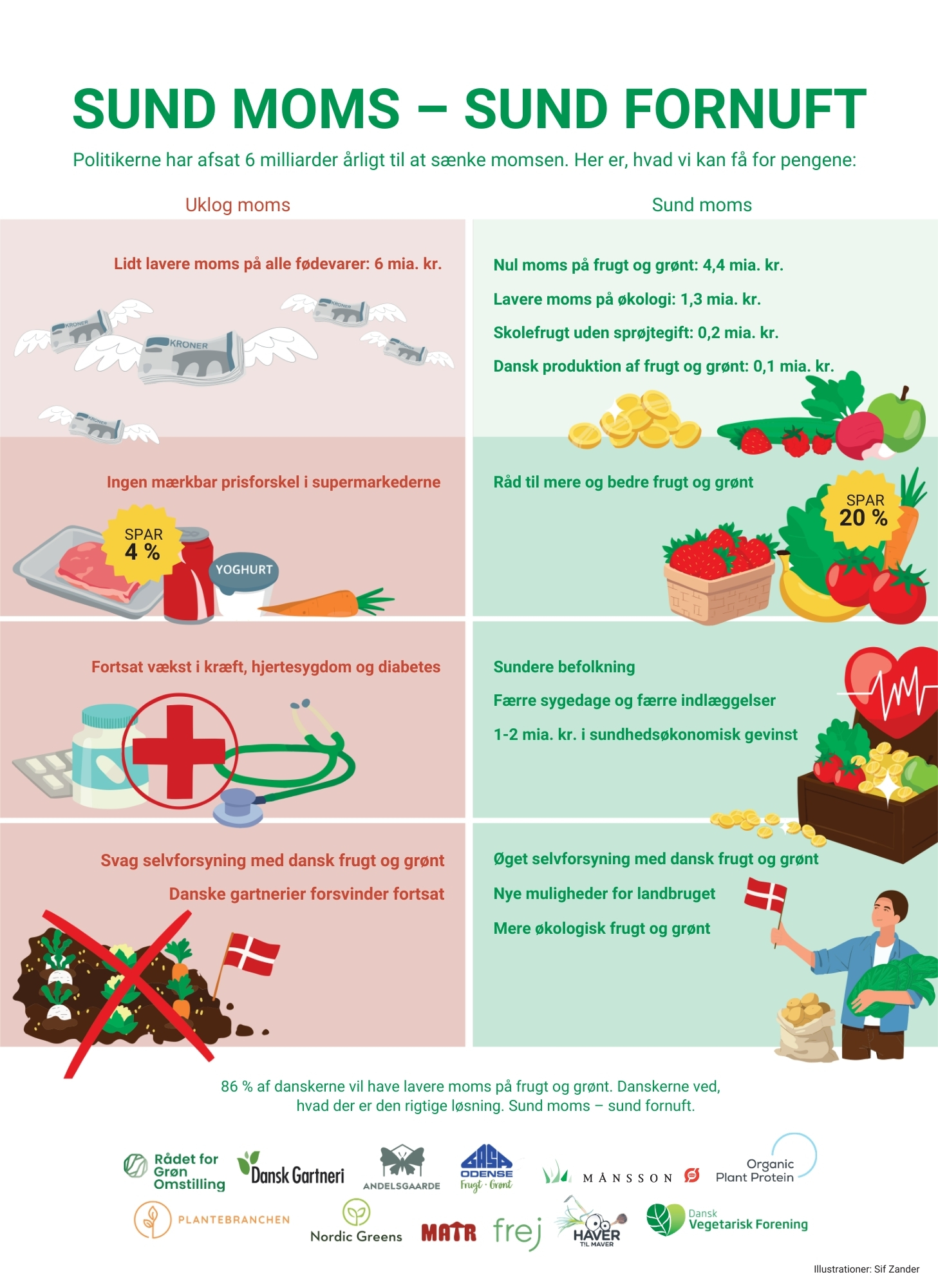 At satse på nulmoms på frugt og grønt er den eneste af de to muligheder, der giver mening både økonomisk, for den danske selvforsyning og for folkesundheden. Budskabet kommer fra 12 organisationer og virksomheder og indrykkes samtidig som en annonce i store danske aviser onsdag og torsdag i denne uge.
