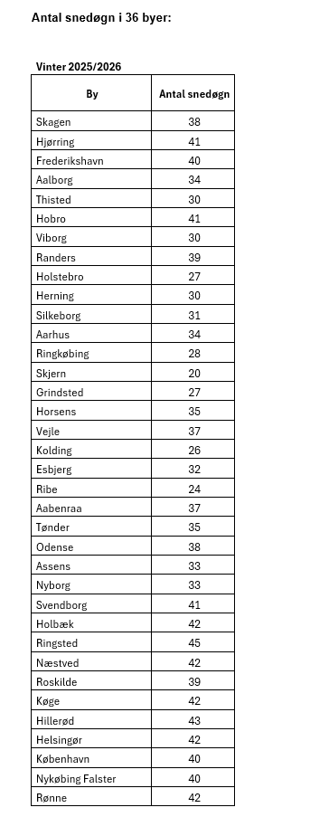 - Danmark havde 30,9 snedækkedøgn i vinteren 2025/2026