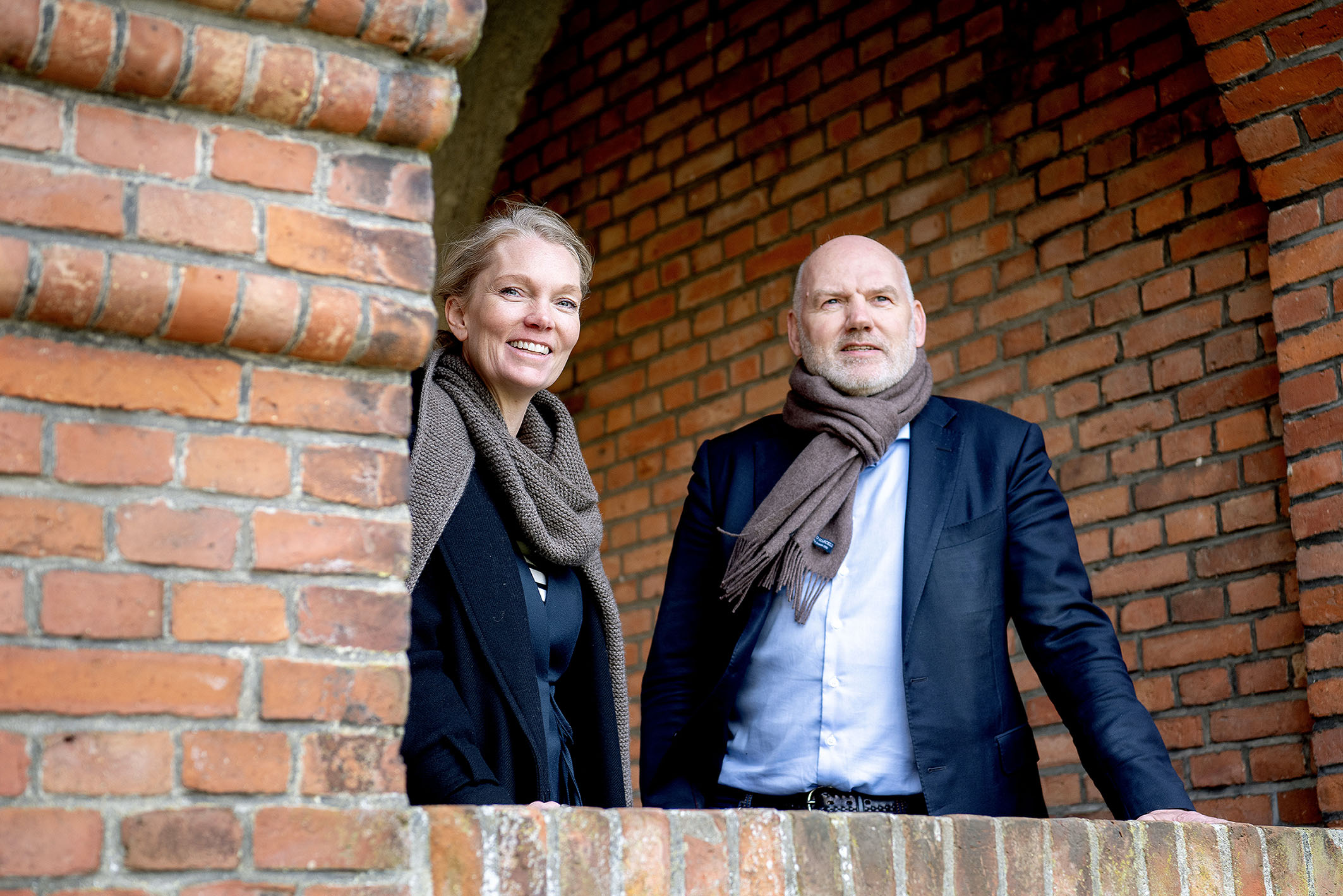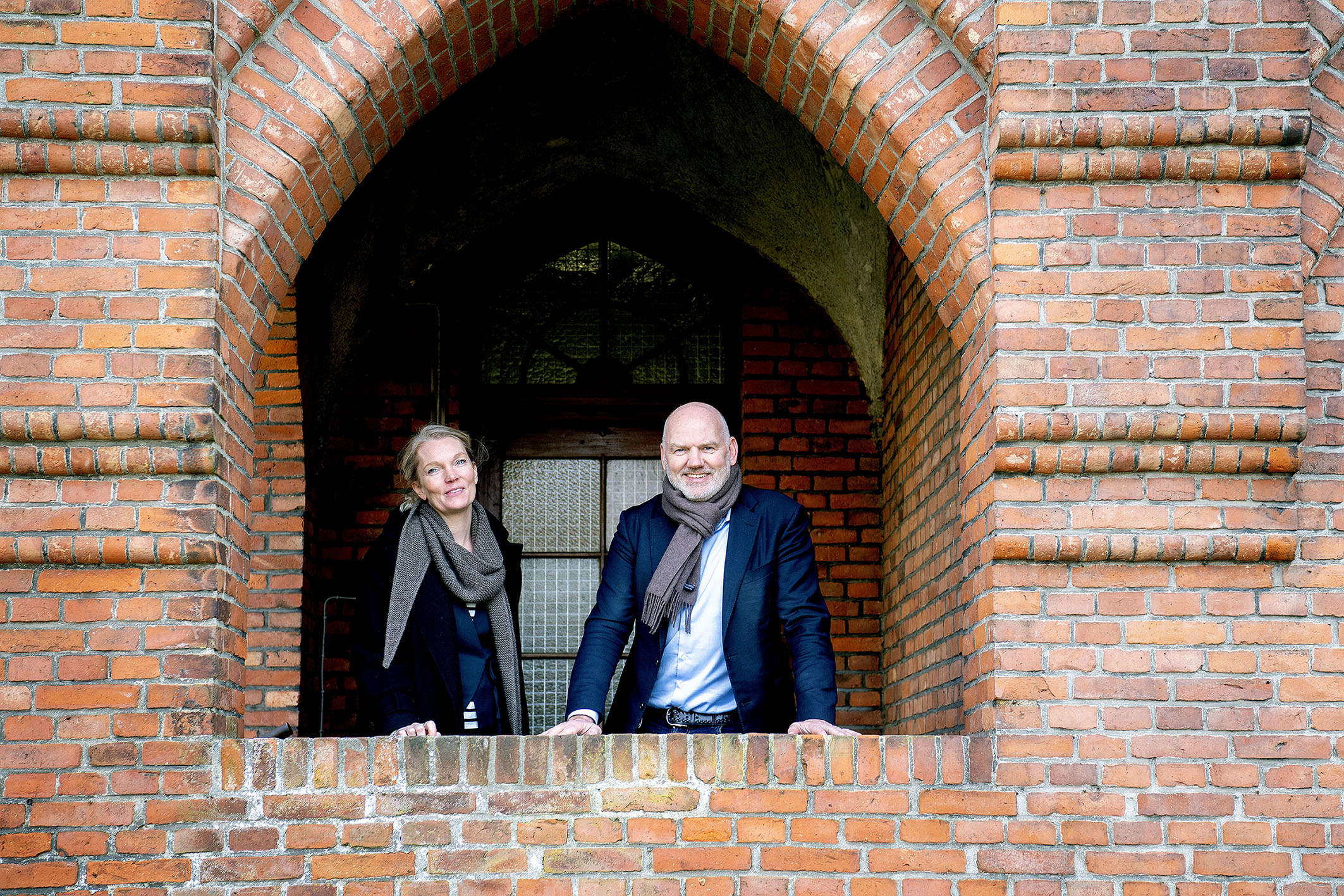 To personer står i en bue af en murstensbygning og smiler mod kameraet.