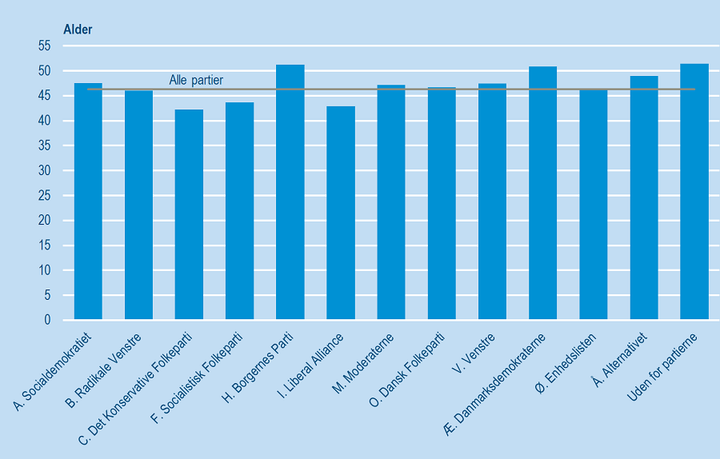 Gennemsnitsalderen på kandidaterne til det kommende folketingsvalg er 46,3 år. Den er lavest i Det Konservative Folkeparti og højest blandt kandidaterne uden for partierne.