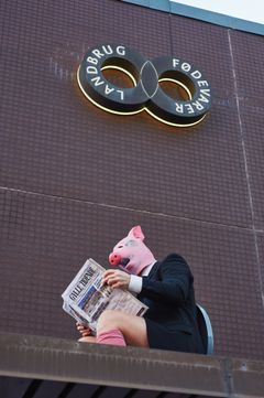 Tre svineaktivister indtog også Landbrug & Fødevarers tag, hvor de iført sorte jakkesæt og grisemasker producerede gylle på medbragte toiletter, mens de læste landbrugslobbyens egne versioner af sandheden i avisen, “Gylle Tidende”. Bag dem gjorde et pink banner Greenpeaces budskab klart: “RED DRIKKEVANDET – STOP SVINERIET”.