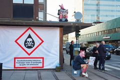 “Sundhedsskadelig lobbyisme. Forårsager rester af sprøjtegifte og gylle i dit drikkevand,” og “Drikkevandet øger din risiko for tarmkræft pga. forurening med nitrat fra svineindustrien,” står der blandt andet på vinduerne.
