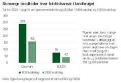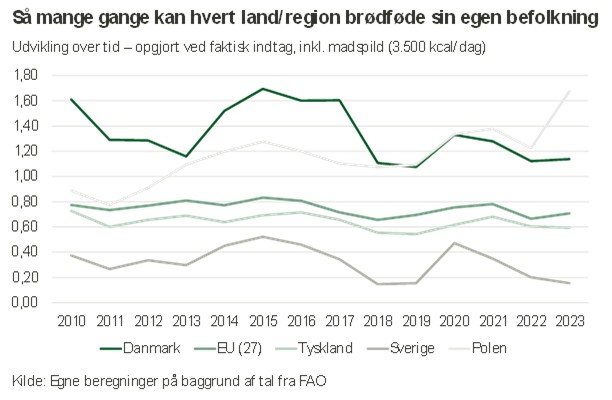 Samtidig viser opgørelsen, at Danmarks evne til at dække sit eget kaloriebehov er faldet siden 2010. Det hænger blandt andet sammen med lavere produktion af kød, korn og sukker samt en voksende befolkning.