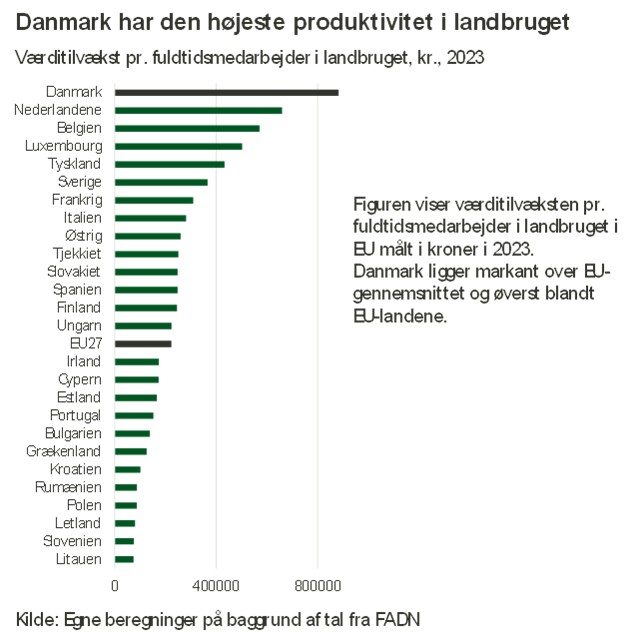 Opgørelsen viser, at dansk landbrug ligger helt i top i EU målt på værditilvækst pr. fuldtidsmedarbejder, hvilket dokumenterer en høj produktivitet og effektiv ressourceudnyttelse. Det betyder, at Danmark ikke alene har kapacitet, men også evnen til at producere stabilt og effektivt i en international sammenhæng.