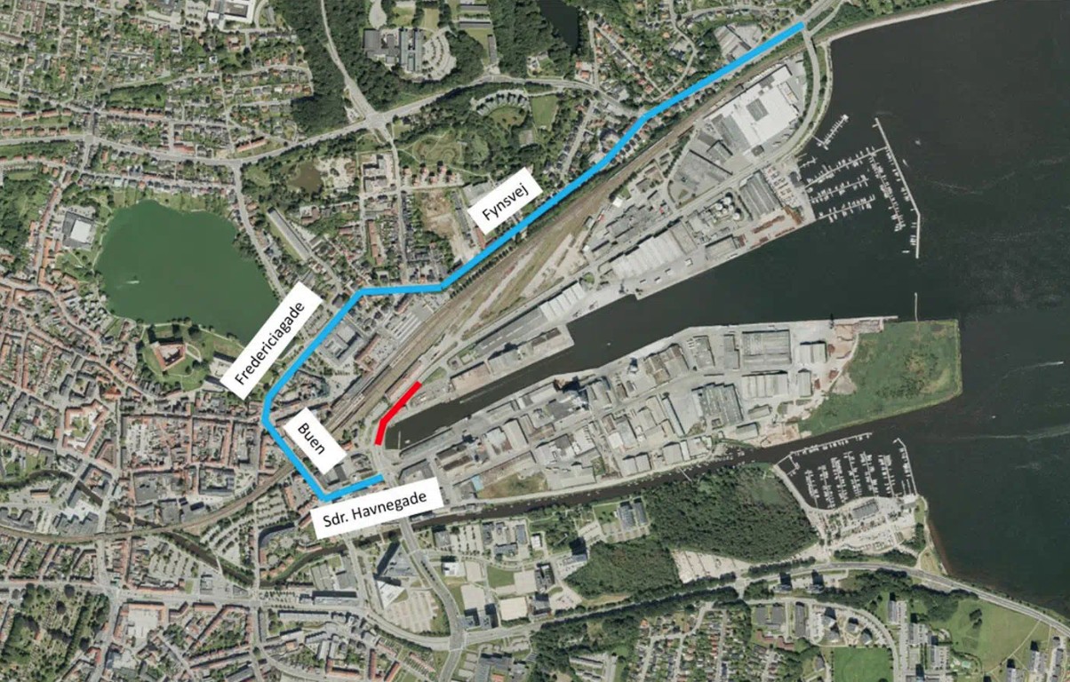 - Cyklister og fodgængere: Cykelsti og fortov vil være spærret ligesom Jens Holms Vej i aften- og nattetimerne, men i begge retninger vil cyklister og fodgængere kunne passere inde på hhv. havnens og Godsets areal.