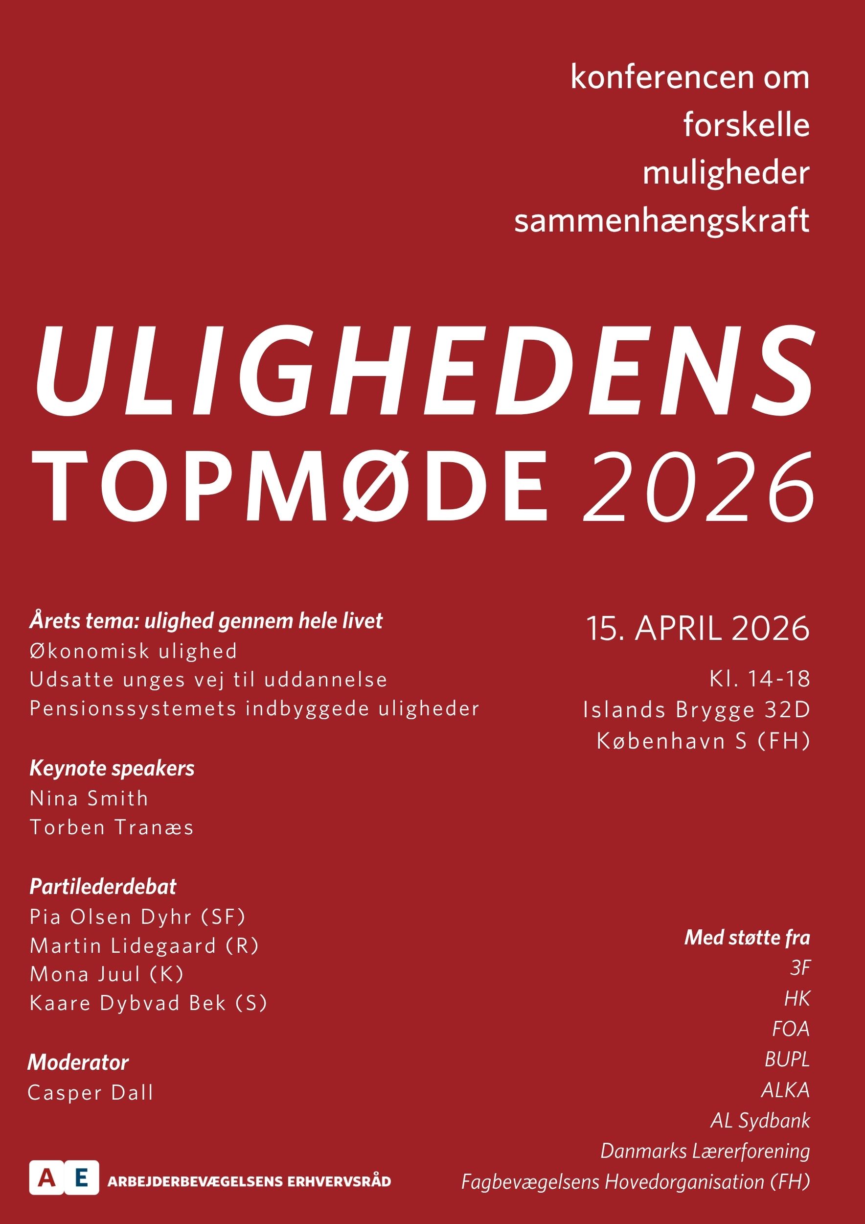 Det er de centrale spørgsmål, som forskere, organisationer og politikere søger svar på onsdag den 15. april 2026 kl. 14. Her er Arbejderbevægelsens Erhvervsråd (AE) vært for Ulighedens Topmøde 2026 på Islands Brygge i København.