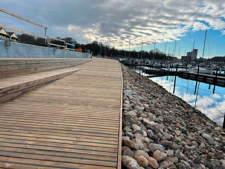 Entreprenøren og byggefolkene skulle egentlig først have været færdig med den første del af havnepromenaden i midten af april. Men trods den lange og hårde vinter er det lykkedes at blive klar til påske, hvor mange sejlere skal have deres båd i vandet og gøre klar til en ny sæson. Mange interesserede vil formentlig også bruge fridagene til at kikke forbi for at se, hvad der er sket på marinaen og måske få en is eller frokost med udsigt over lystbådehavnen og fjorden.