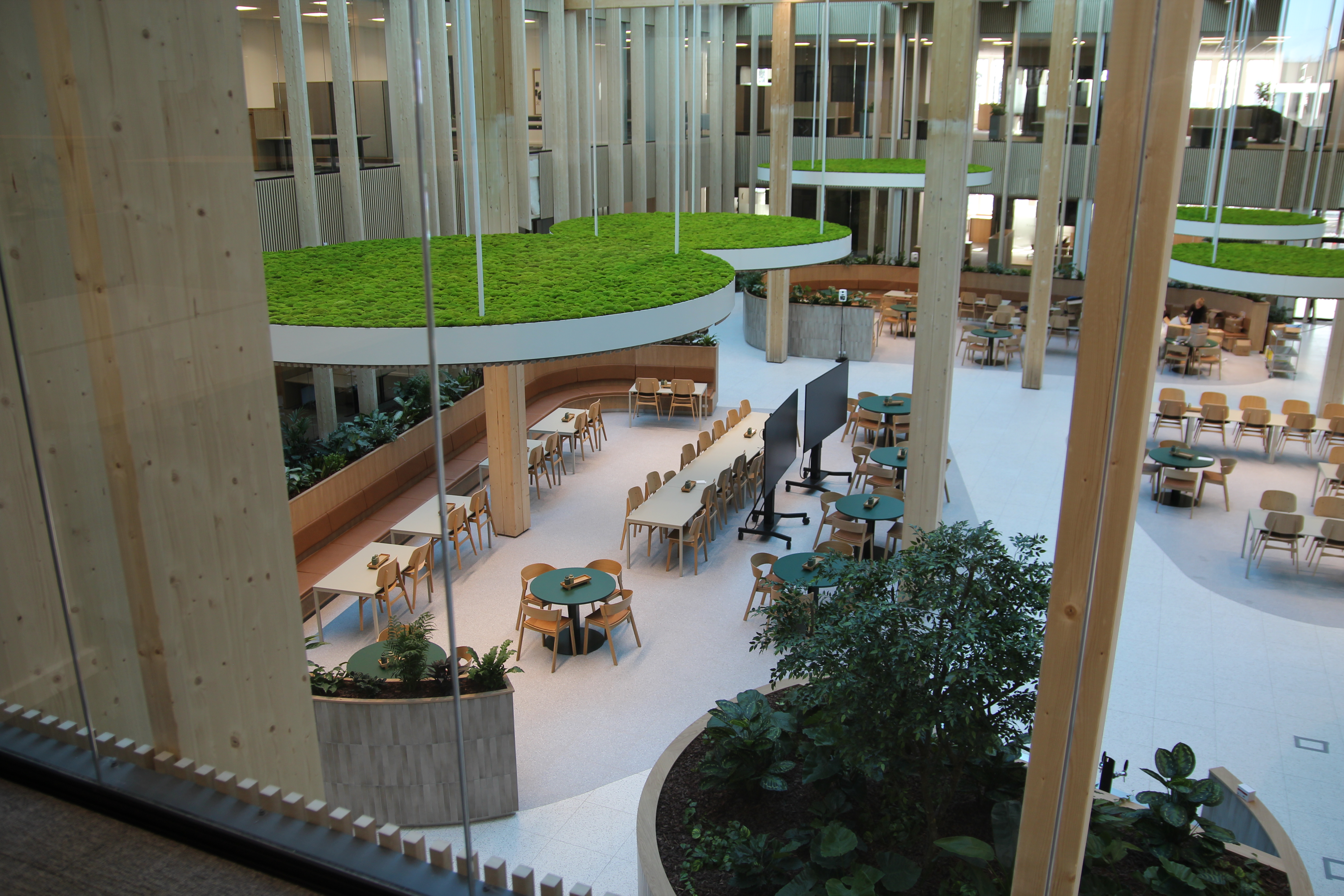 Helt enkelt rummer det nye kontor fleksible arbejdsområder, mange møderum i flere størrelser – fra telefonrum og mindre mødelokaler til større mødefaciliteter – samt et indbydende centrum, hvor kantinen med plantevægge og godt otte meter høje limtræssøjler fungerer som et naturligt samlingspunkt i hverdagen.