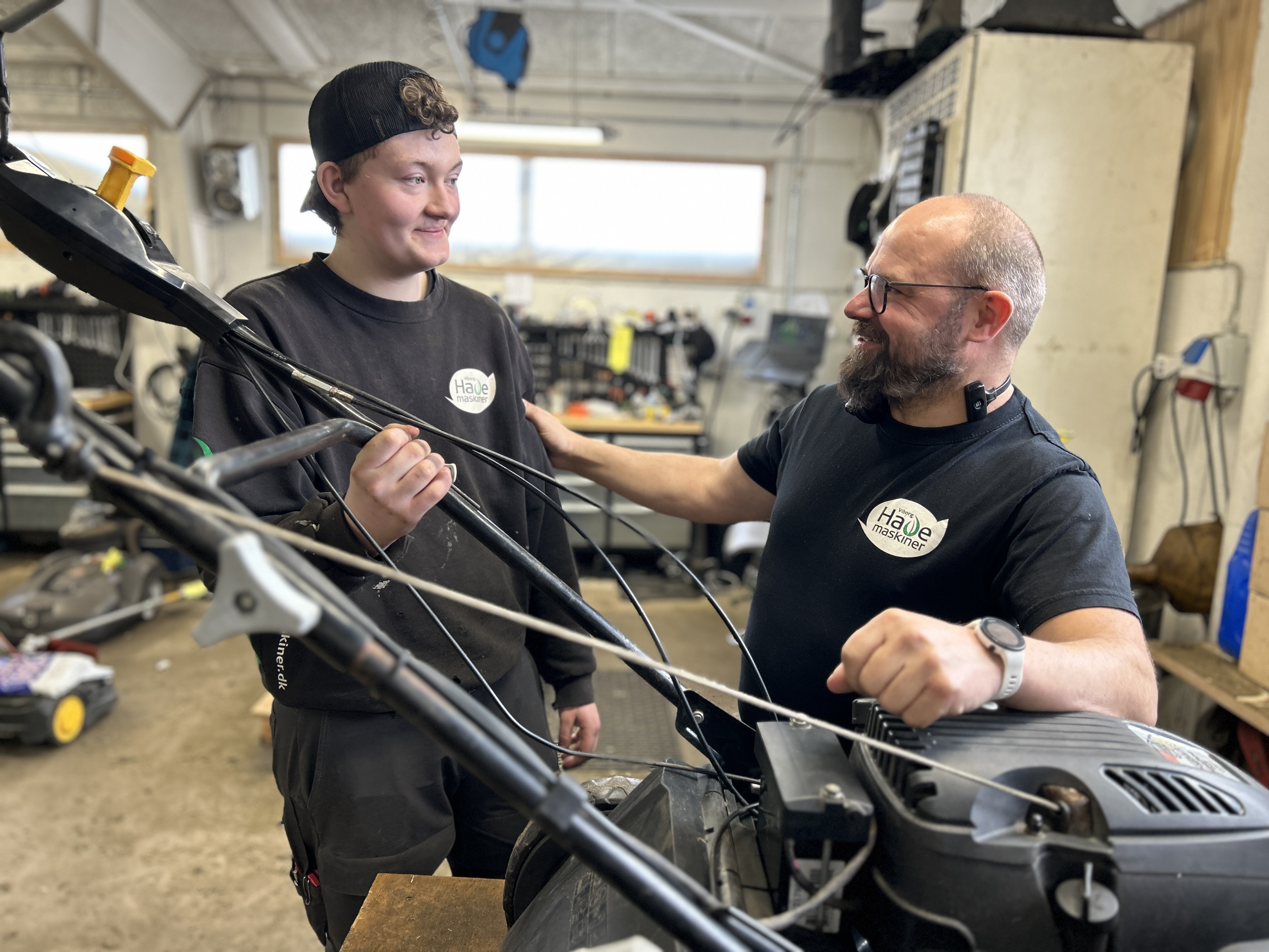Karl Astrup Bitsch og hans mester Henrik Bøgebjerg fra Viborg Havemaskiner er blandt dem, der varmt kan anbefale ordningen. Karl går i 9. klasse på Overlund Skole, og han har hele skoleåret været i praktik tirsdag og torsdag på Henriks værksted.
