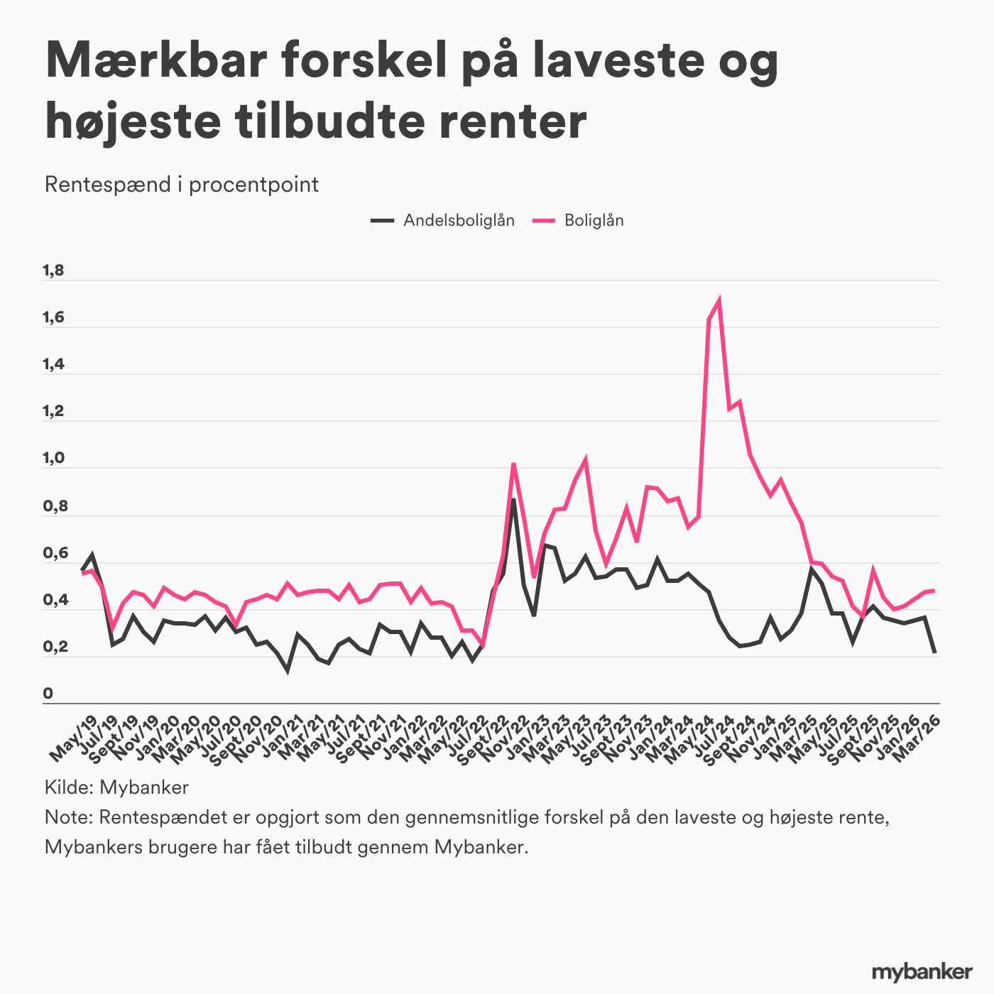 Den gennemsnitlige rente dækker over mærkbare forskelle på de højeste og laveste renter på lån, som Mybankers brugere er blevet tilbudt af bankerne. I marts lød den gennemsnitlige forskel på 0,5 procentpoint for boliglån og 0,2 procentpoint for andelsboliglån.