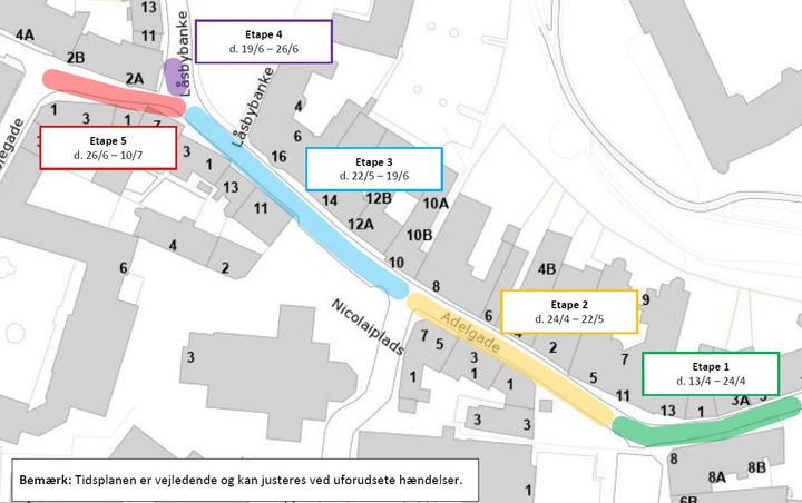 - Adelgade – etapen frem til Blæsbjerggade/Låsbygade: 22. maj-19. juni