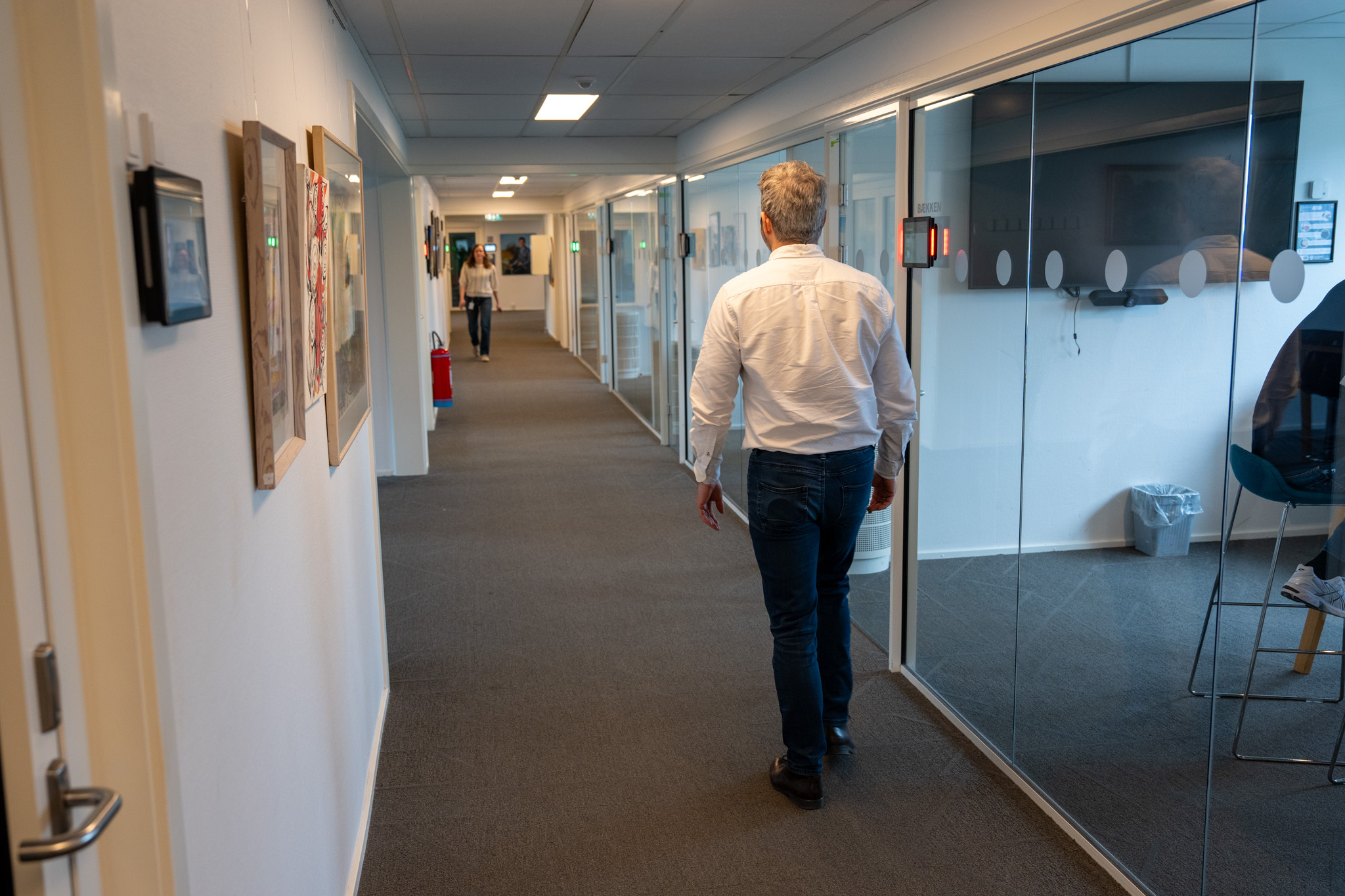 En mand går ned ad en gang i Kultur- og Borgerhuset i Vallensbæk. Væggene har glaspartier og kunstværker.