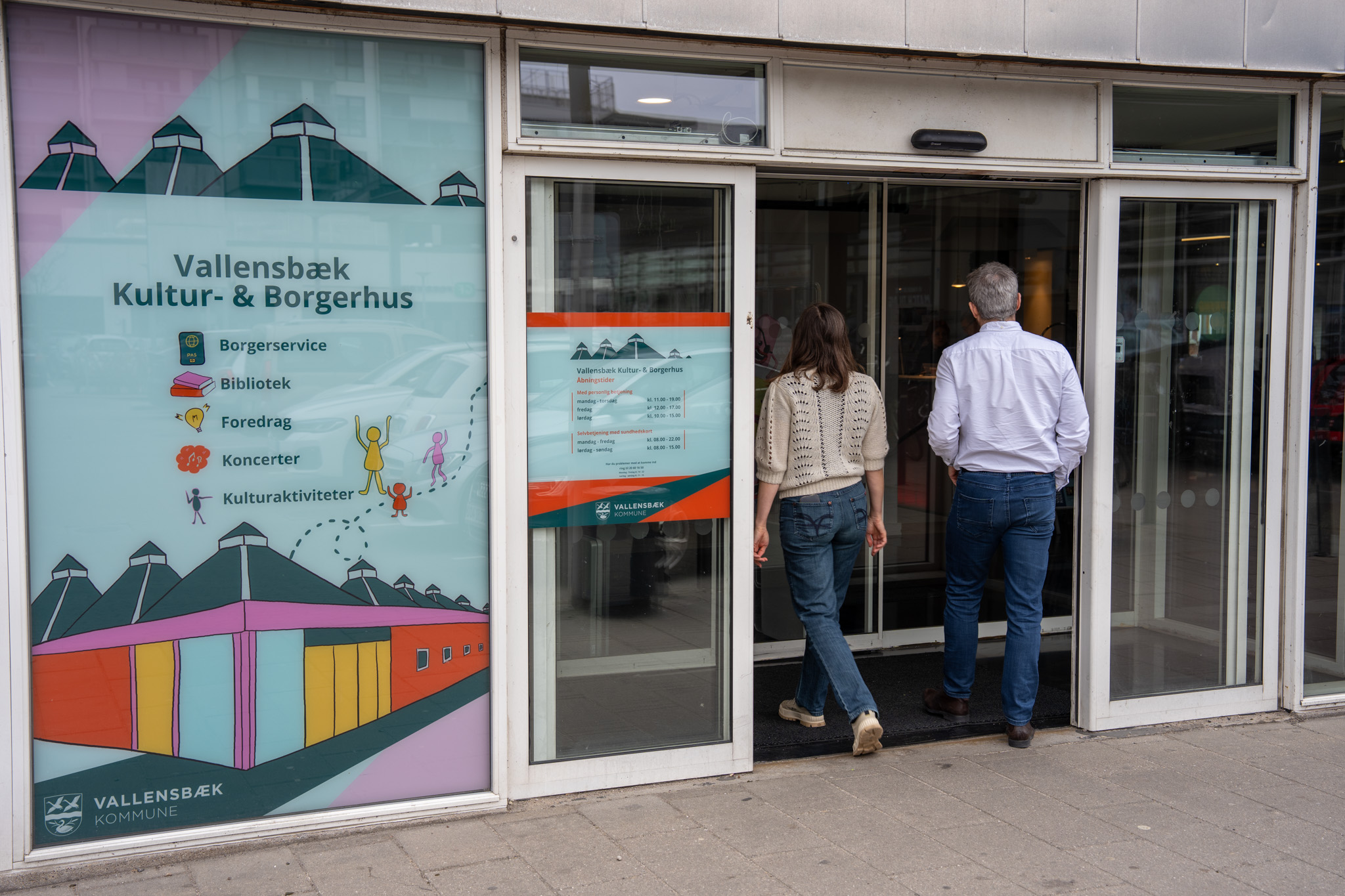 To personer går ind i Vallensbæk Kultur- og Borgerhus.