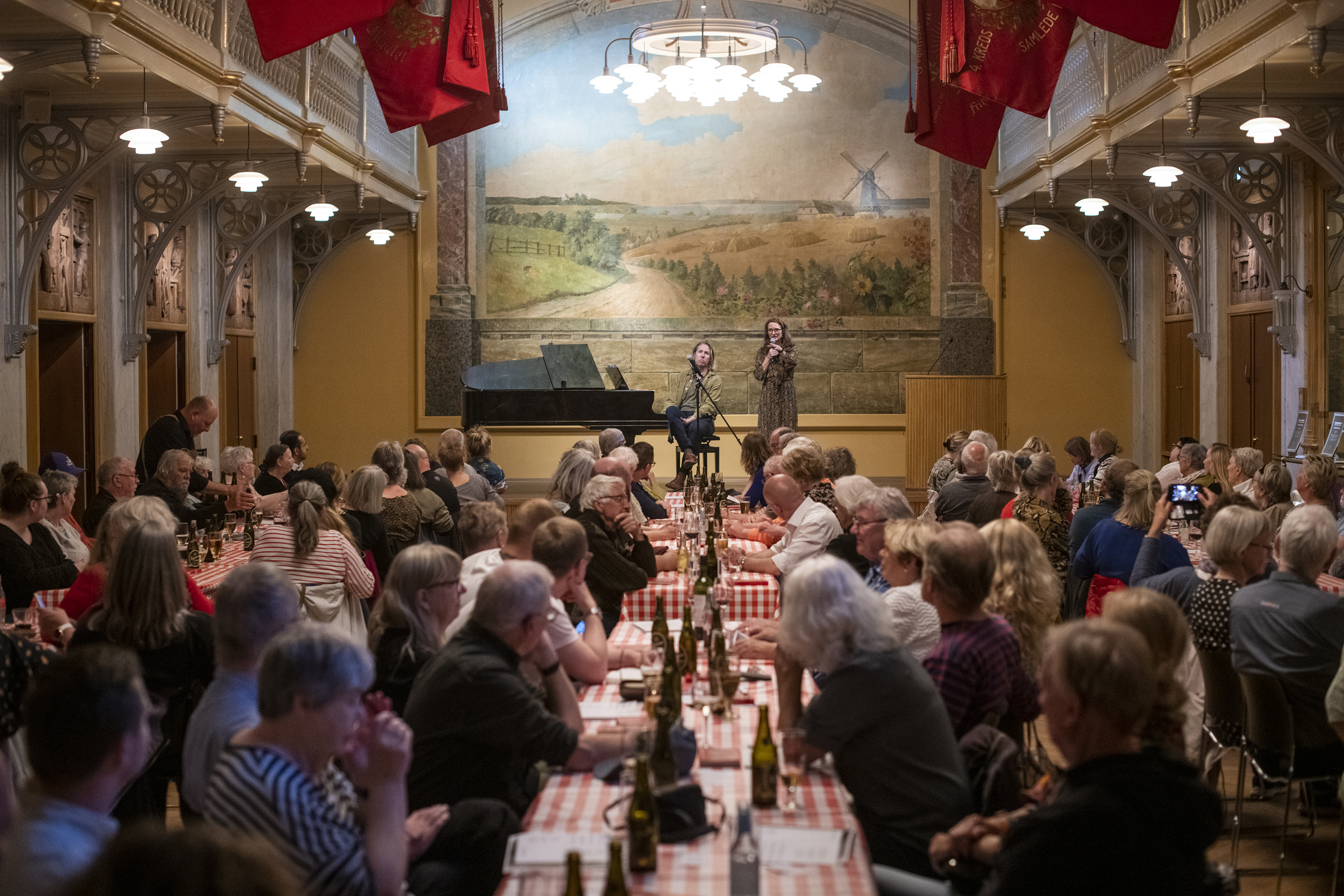 ”Fællessang er en kilde til mental sundhed og sammenhængskraft. Der er altid blevet sunget højt i forsamlingsbygningens festsal – til generalforsamlinger, foredrag, fester og kampdage. I forbindelse med corona opstod der en endnu større interesse for fællessang og et behov for fysisk fællesskab, som vi siden har dyrket, blandt andet i form af arrangementet Fællessang og Folkets køkken, hvor historiefortælling og sang bygger bro mellem fortid og nutid,” siger Josefine Albris.