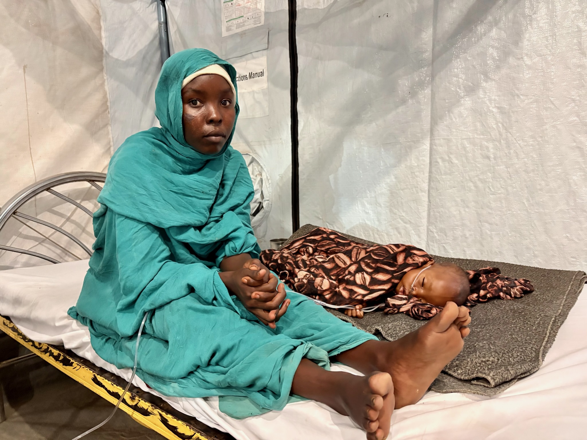 Oktober 2025: Akut underernærede Abdul, under ét år gammel, får behandling på Læger uden Grænsers intensivafdeling i Tawila, Norddarfur. Hans mor, Saleema Mahmoud, flygtede fra Zamzam-lejren efter et RSF‑angreb, der dræbte 15 familiemedlemmer. Tawila, Norddarfur, Sudan.