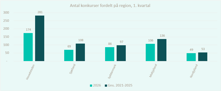 Udviklingen går i den rigtige retning i alle landets regioner. Særligt i Hovedstaden, på Sjælland og i Midtjylland ligger både konkurser og jobtab tydeligt under det niveau, som har præget de seneste år.