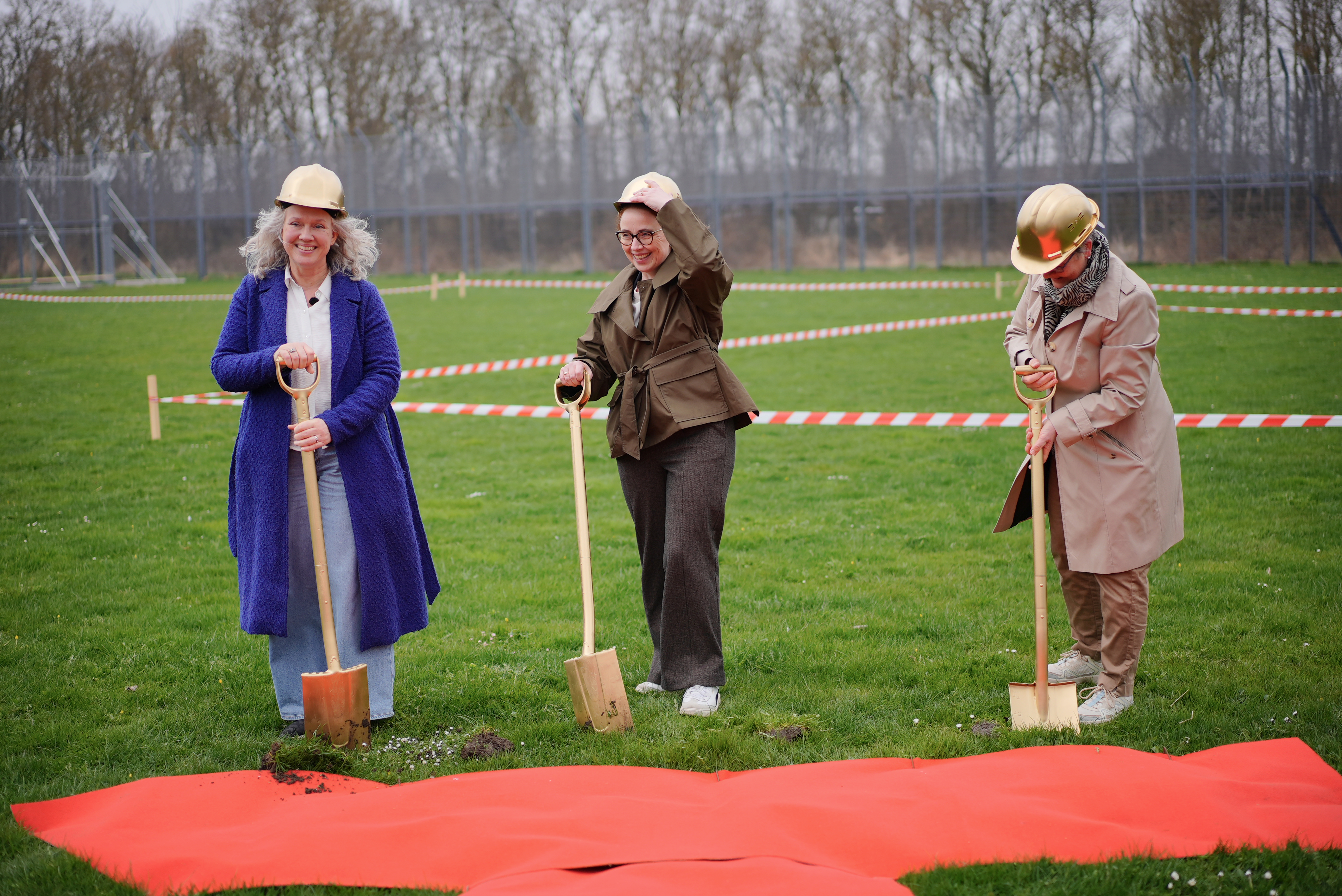 Det første spadestik blev taget i fællesskab af Tina Krintéll (t.v.), forstander på Kofoedsminde, regionsrådsformand Trine Birk Andersen (i midten) og Pia Bille, socialdirektør i Region Sjælland (th.).