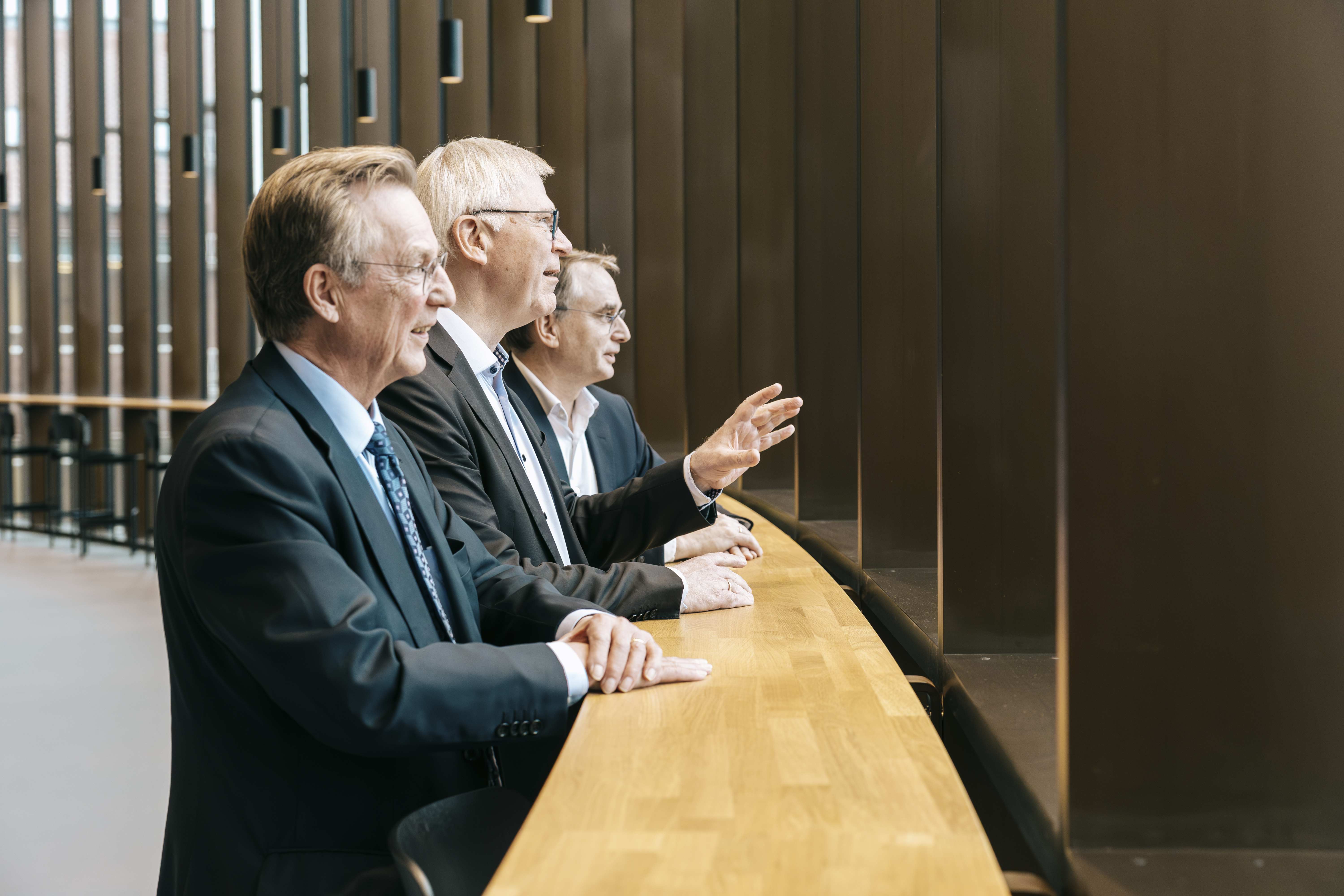 Midt i den runde glasbygning står tre herrer og betragter stemningen her i hjertet af Universitetsbyen.