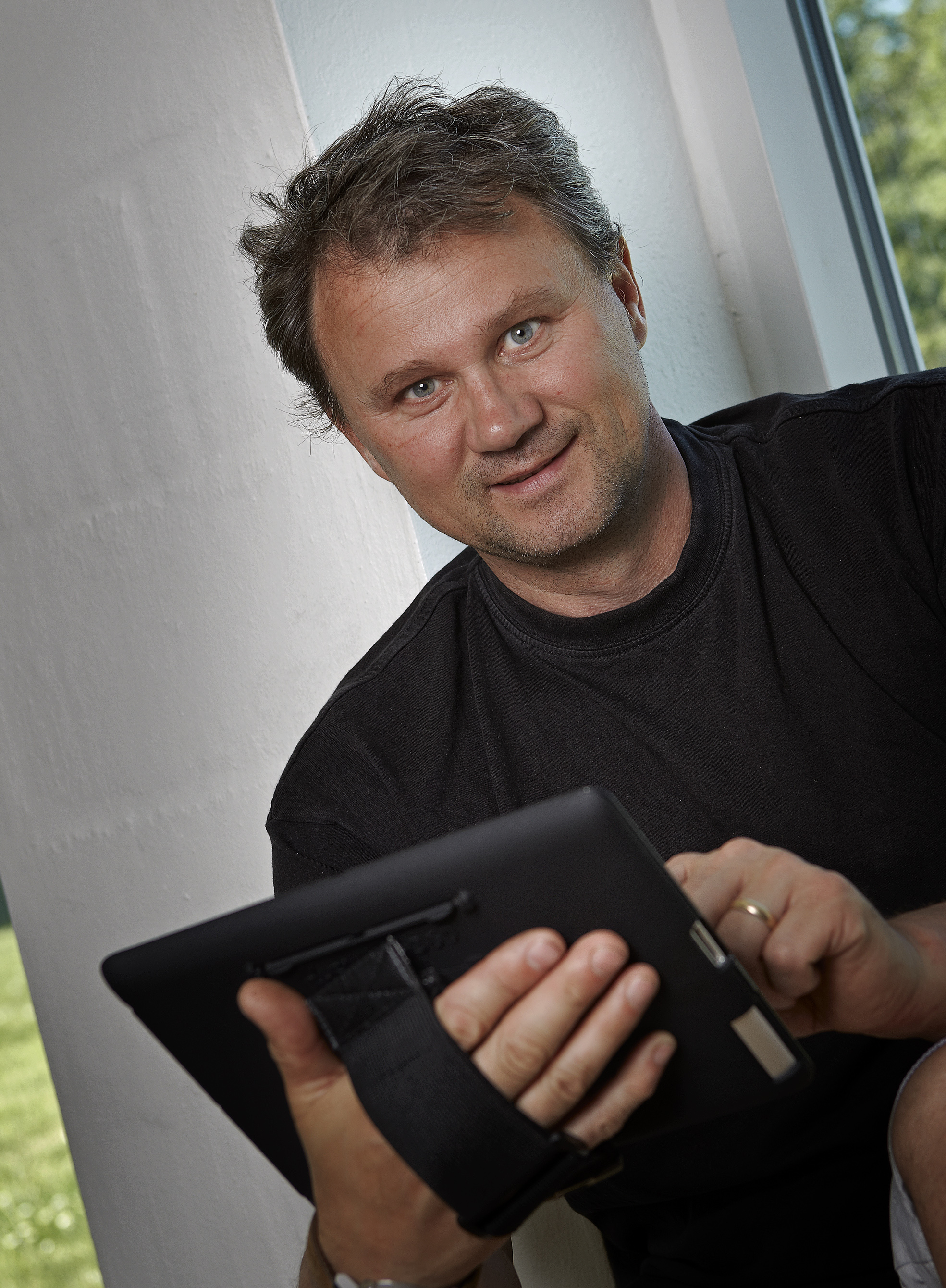 - Det fleksible cover med håndrem er en oplagt måde at beskytte iPad’en på. Samtidig gør cover og håndrem det muligt at bruge iPad’en på flere forskellige måder. Man kan f.eks. stille iPad’en fra sig på bordet, så den er skrivevenlig, eller rotere den efter behov i hånden. Når man er færdig med at bruge den, putter man den bare i den medfølgende pose. Så er den beskyttet i skoletasken, siger han.