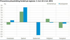 Største prisstigning på enfamiliehuse var i Region Sjælland med 2,2 pct., mens priserne steg med 0,7 pct. i Region Midtjylland. Priserne var uændrede i Region Syddanmark, mens de faldt i Region Nordjylland med 1,2 pct. og i Region Hovedstaden med 0,5 pct. For ejerlejligheder steg priserne på landsplan med 0,5 pct. Største prisstigning for ejerlejligheder var også i Region Sjælland med 3,1 pct., mens Region Hovedstaden steg 0,4 pct. I de øvrige tre regioner faldt priserne – mest i Region Syddanmark med 2,7 pct.