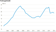 Faldet i forbrugerkreditten, dvs. husholdningernes forbrugslån uden om banker og realkreditinstitutioner, skyldes, at købekort faldt med 3,1 pct. til 8,0 mia. kr., mens blankolån og kredit mod sikkerhed samlet set lå relativt stabilt. Til sammenligning udgjorde bankernes udlån til forbrugerkredit til husholdninger 97 mia. kr., mens de samlede udlån til husholdninger udgjorde 430 mia. kr. for bankerne ved udgangen af marts 2015.
