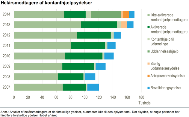 Stigningen i antallet af helårsmodtagere af kontanthjælpsydelser det seneste år dækker over store forskydninger mellem forskellige ordninger som følge af ændringer på kontanthjælpsområdet. Bl.a. har unge under 30 år uden en kompetencegivende uddannelse fra 1. januar 2014 ikke længere kunnet modtage kontanthjælp, men derimod uddannelseshjælp, som er en ny type ydelse. I 2014 modtog 42.200 helårsmodtagere uddannelseshjælp. Enheden helårsmodtagere fremkommer ved, at man lægger alle de dage, hvor ydelserne er modtaget, sammen og deler med 365.