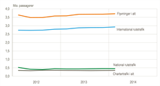 Den nationale rutetrafik faldt med 1 pct. fra fjerde kvartal 2014 til første kvartal 2015, mens den internationale rutetrafik var næsten uændret. Charter- og taxitrafikken faldt med 1 pct. i forhold til kvartalet før. Tallene er korrigeret for normale sæsonudsving.